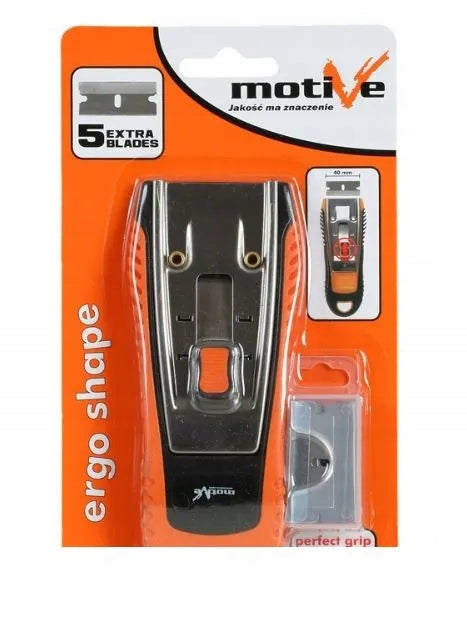 Skrobak do szyb MOTIVE – idealny do czyszczenia szkła, luster i płyt indukcyjnych. Antypoślizgowy uchwyt i 5 zapasowych ostrzy w zestawie.