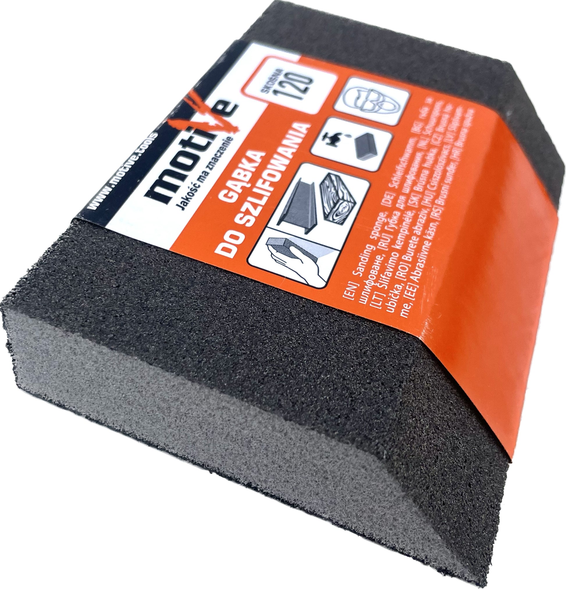 Gąbka ścierna MOTIVE – czterostronna, z bokiem ściętym pod kątem 45°. Idealna do szlifowania drewna, metalu i farby, także w trudno dostępnych miejscach.