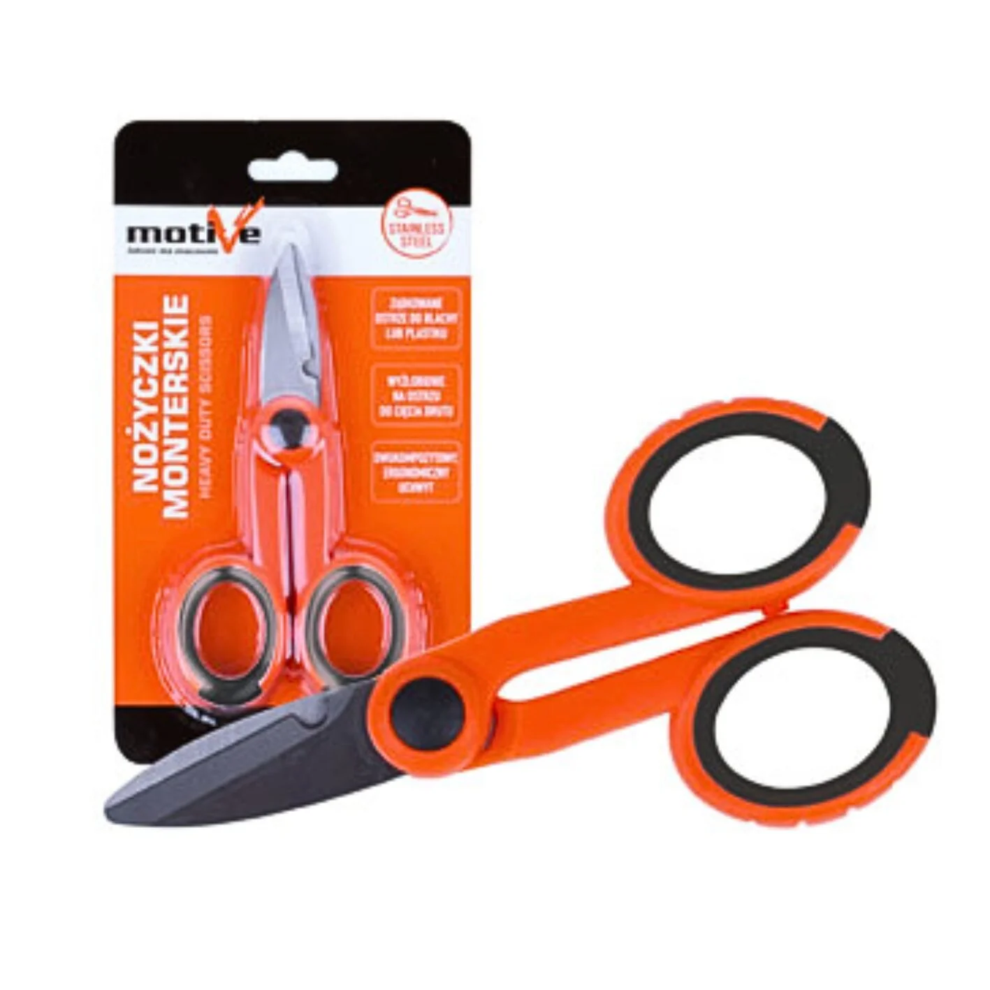 Nożyczki monterskie MOTIVE 145 mm – precyzyjne cięcie przewodów, uszczelek i tworzyw. Stal nierdzewna, ergonomiczny uchwyt, rowek do izolacji.